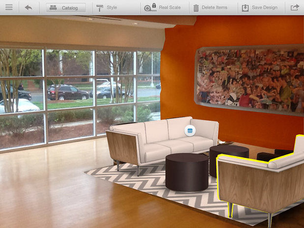 Once we painted the walls orange, we decided to redecorate the lobby with new furniture. Through the product catalog, users are presented with a wide range of furniture options from which to choose. The catalog includes furniture, accents, art, curtains, books, etc., and products can be sorted by type of room, e.g. living room. Each product from the catalog can be added to your design and users can link back to a webpage to learn more about the product.