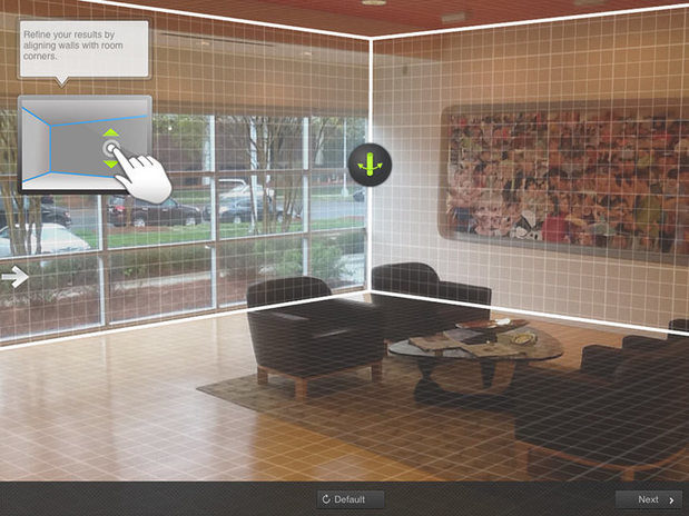 Once the photo has been taken, the next step is to establish the depth and perspective of the room. The app uses a three dimensional grid tool overlay to suggest the edges of the walls, ceiling and floor. Adjusting the room takes a little practice, but once you get the hang of it, the grid overlay is very intuitive and easy to align with the shape of the room.