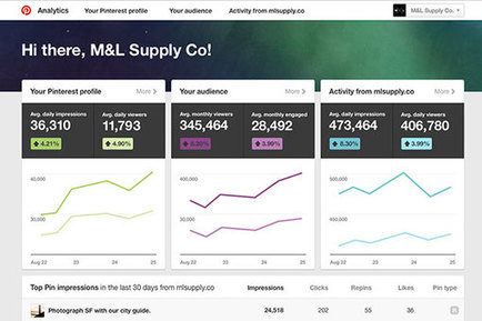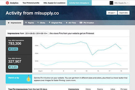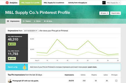 The main analytics dashboard also provides a quick overview of the top five pins from the last 30 days with total impressions, clicks, repins and likes, along with pin type, i.e., whether or not the pin was classified as a “rich” pin. A rich pin includes additional information, such as pricing, and ranks higher in Pinterest search results.