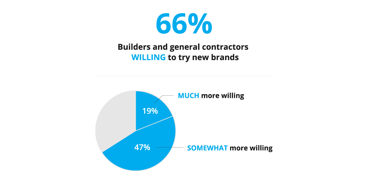 - Of ALL builders and general contractors, 66% are willing to try new brands, emphasizing an opportunity for challenger brands to gain market share.